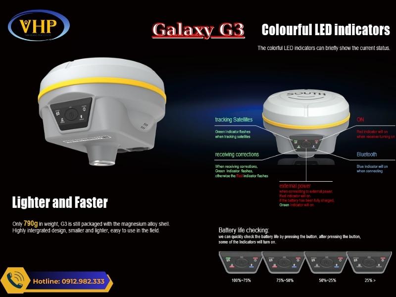 Máy GPS RTK Galaxy G3 Mang trong mình sự kết hợp hoàn hảo giữa thiết kế nhỏ gọn và cấu hình mạnh mẽ. Với trọng lượng chỉ 790g, với lớp vỏ hợp kim magiê bền bỉ, Galaxy G3 rất thuận tiện cho việc di chuyển đo ở địa hình phức tạp. Tính năng bù nghiêng IMU mạnh mẽ với góc nghiêng lên đến 60°. Sức mạnh của máy Galaxy G3 được thể hiện rõ nét qua bộ vi xử lý Soc hoàn toàn mới. Hiệu năng đo đạc là hoàn toàn vượt trội. Hơn nữa, nó còn giúp tiết kiệm pin và tăng tuổi thọ cho máy. Khả năng phát base “Siêu khỏe” với giao thức Farlink với công suất lên đến 3W. Đèn LED nhiều màu giúp người dùng nhanh chóng nhận biết tình trạng hoạt động của máy. Với Galaxy G3 chắc chắn sẽ mang đến trải nghiệm đo đạc chưa từng có cho mọi khách hàng.