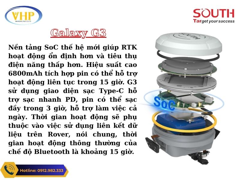 Nền tảng SoC thế hệ mới giúp RTK hoạt động ổn định hơn và tiêu thụ điện năng thấp hơn. Hiệu suất cao 6800mAh tích hợp pin có thể hỗ trợ hoạt động liên tục trong 15 giờ. Galaxy G3 sử dụng sạc Type-C hỗ trợ sạc nhanh PD, pin có thể sạc đầy trong 3 giờ, hỗ trợ làm việc cả ngày. Thời gian hoạt động sẽ phụ thuộc vào việc sử dụng liên kết dữ liệu trên Rover, nói chung, thời gian hoạt động thông thường của chế độ Bluetooth là khoảng 15 giờ.