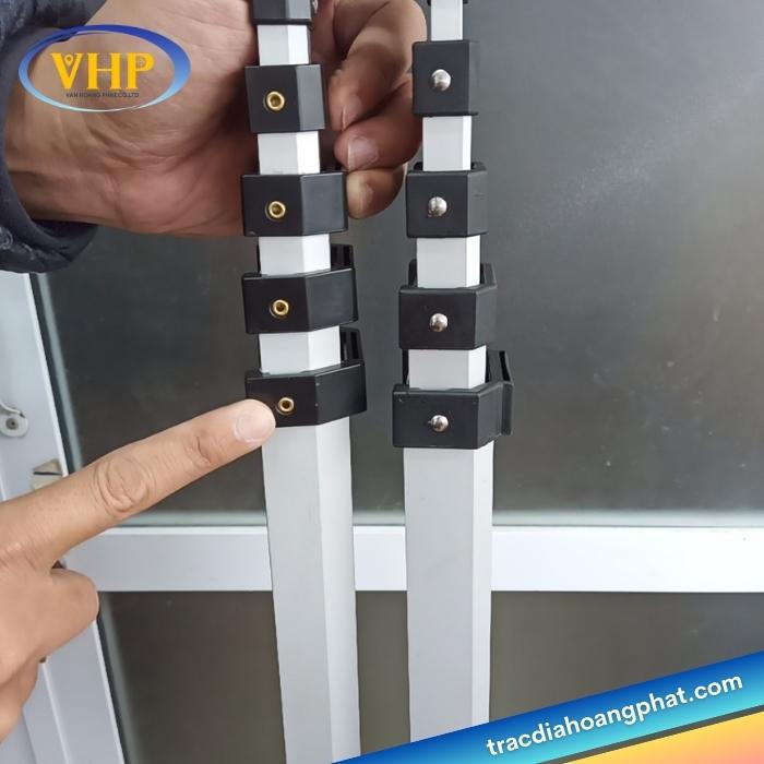 - Chiều dài: 5m với 5 đoạn, thiết kế xếp lồng vào nhau. Giữa các đốt được nối với nhau bằng chốt mia (nút mia)